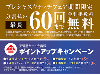 期間中は、特別に分割払い60回まで金利手数料が無料になるキャンペーンや、天満屋カード会員様限定のポイントアップキャンペーンなど、魅力的な特典をご用意しております。