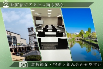 倉敷駅周辺にはビジネスホテルや観光向け宿泊施設がそろっており、遠方からの参加者を含む会議や研修にも対応しやすい立地です。