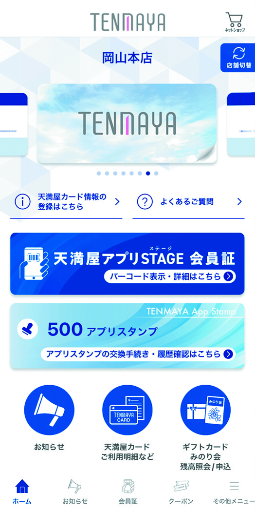 アプリ画面上で、以下の通り天満屋アプリSTAGE会員証とアプリスタンプ数が表示されていれば、ご入会、ログイン状態となります。![]() |