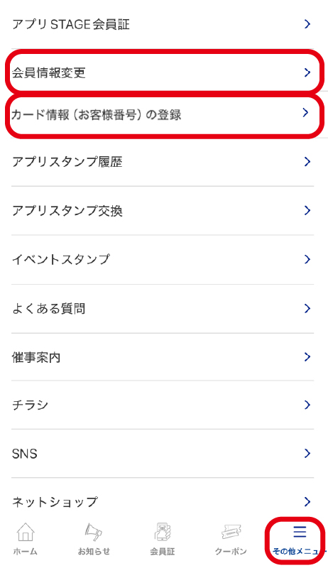 画面右下の三本線(その他メニュー)の会員情報変更の下の“カード情報(お客様番号)の登録”から登録できます。 その際、お客様番号10桁と、生年月日が必要になります。 ※任意でご入力いただいた生年月日と、カード情報ご登録時にご入力いただいた生年月日が異なる場合には、カード情報ご登録時のご入力生年月日を会員情報として修正させていただきます |